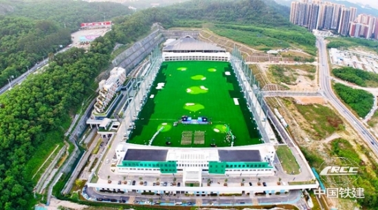 作為“軌道+文體”戰略實踐成果,該項目創新利用原有地鐵上蓋工程新建功能建筑,項目團隊踐行中鐵建設“五大建造”理念,制定專項施工方案,精確驗算施工荷載,創新既有柱體拆除及功能預留技術,拆除上蓋485根混凝土預留柱,把控2.1萬方回填土質量,用時6個月完成2棟新建配套用房、約3.6萬平方米人造草坪鋪設,打造全場景、全時段的高爾夫運動生態。