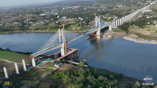 渠江特大橋位于四川省渠縣,是成達萬高鐵名副其實的“咽喉工程”,更是全線“3隧4橋”重難點控制工程的核心一環。大橋全長1983.81米,矮塔斜拉主橋橋長556.7米,主橋懸澆梁36段,橋面寬14.6米,主塔高為50米,共設40根斜拉索,它的合龍為全線貫通鋪好了“最后一塊關鍵拼圖”。